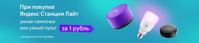 Приобретайте Яндекс Станцию Лайт в нашем магазине — получайте умную лампочку или умный пульт всего за 1 рубль! Акция действует с 24 августа по 20 сентября 2021 года.